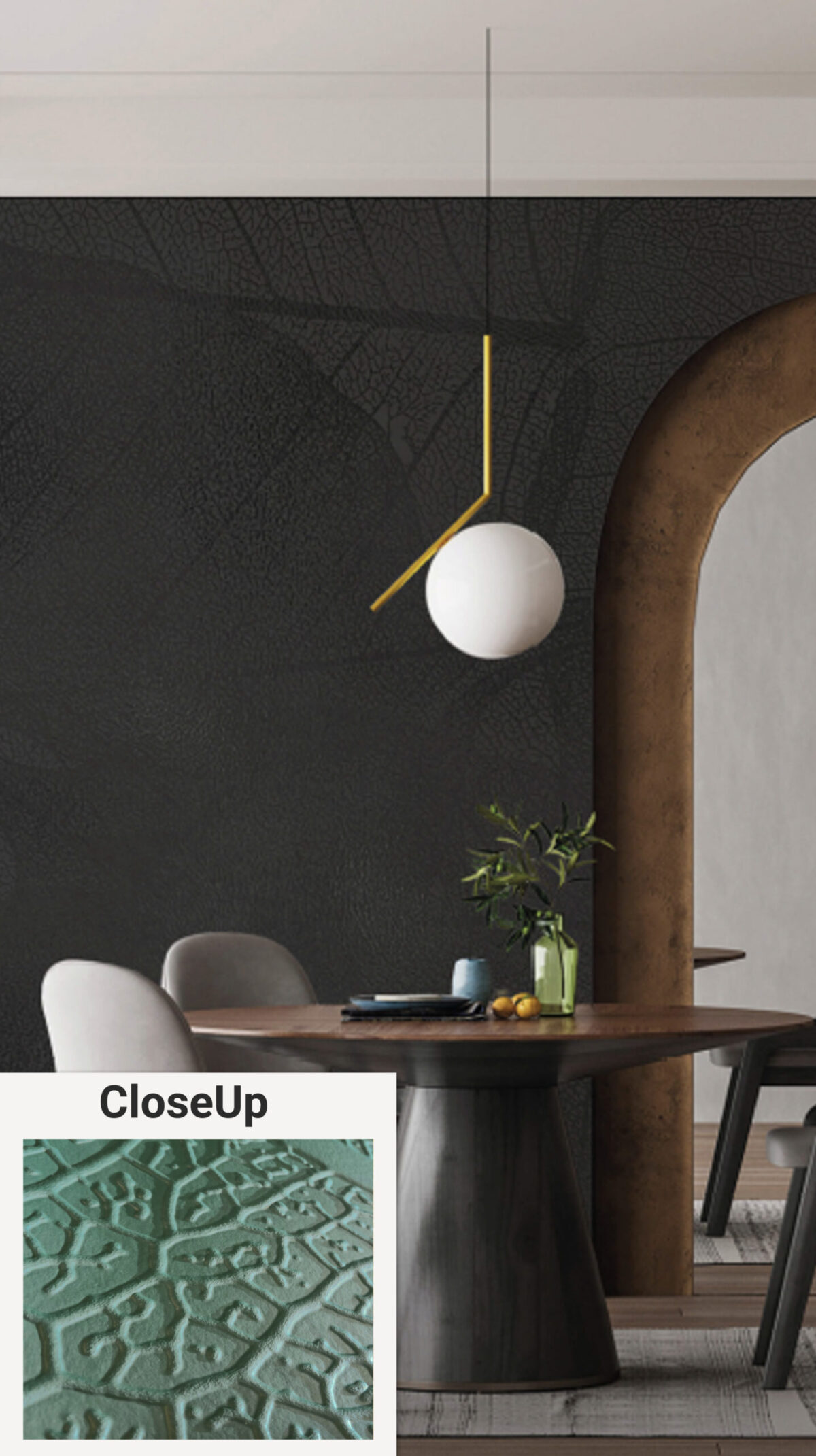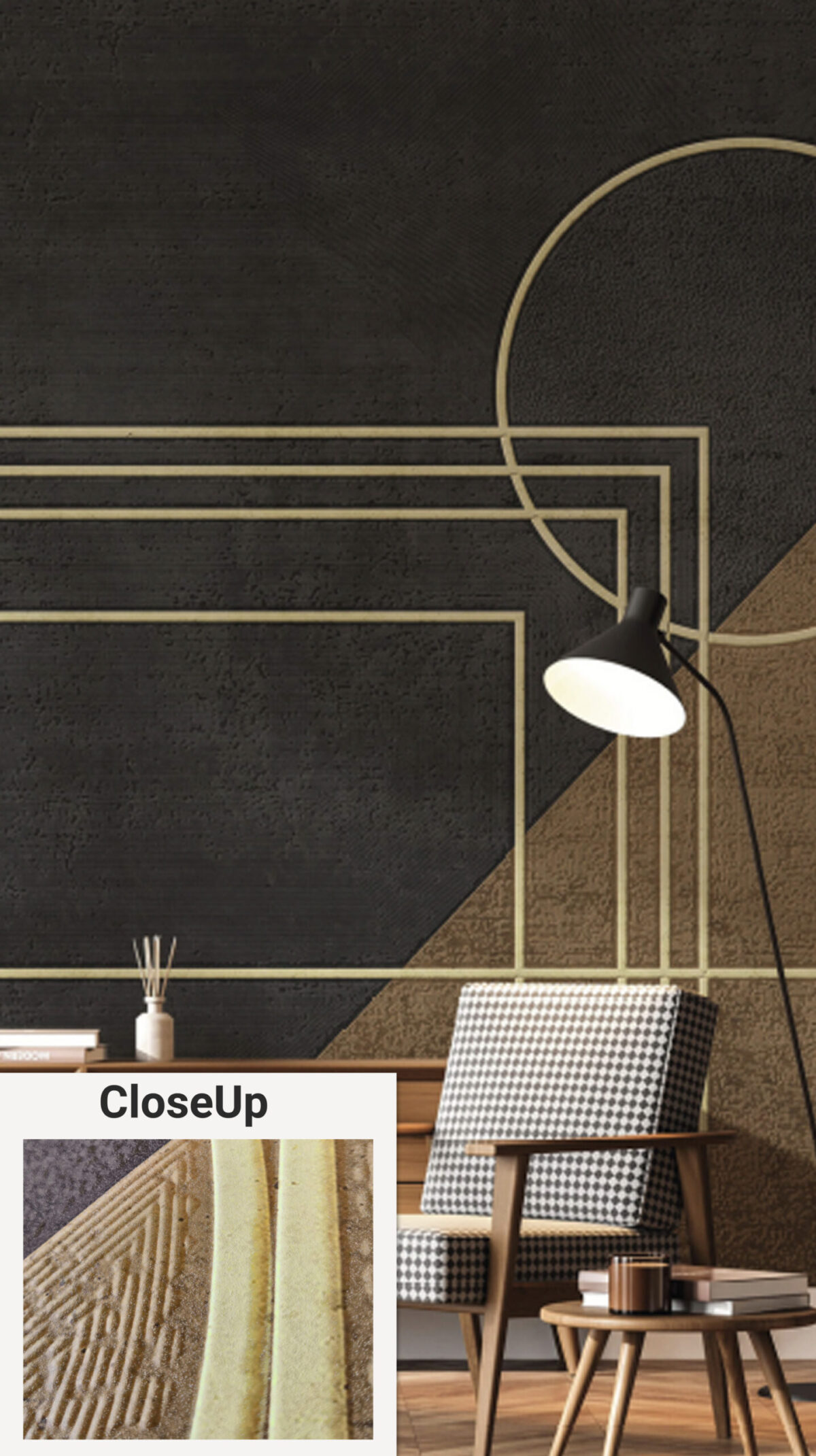 Structuur voegt rust toe, diepte geeft betekenis, niveau maakt het verschil. De afbeelding hiernaast toont een wand na installatie, afgewerkt met een warme, donkere muurverf. Het reliëf vangt het licht en creëert een subtiele gelaagdheid precies zoals bedoeld.